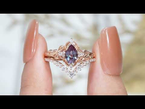 Celebrate nature's beauty with this Pear Cut Alexandrite Leaf Engagement Ring. A color-changing Alexandrite sits elegantly amid delicate, nature-inspired leaf details—a perfect choice for nature lovers seeking a unique ring.