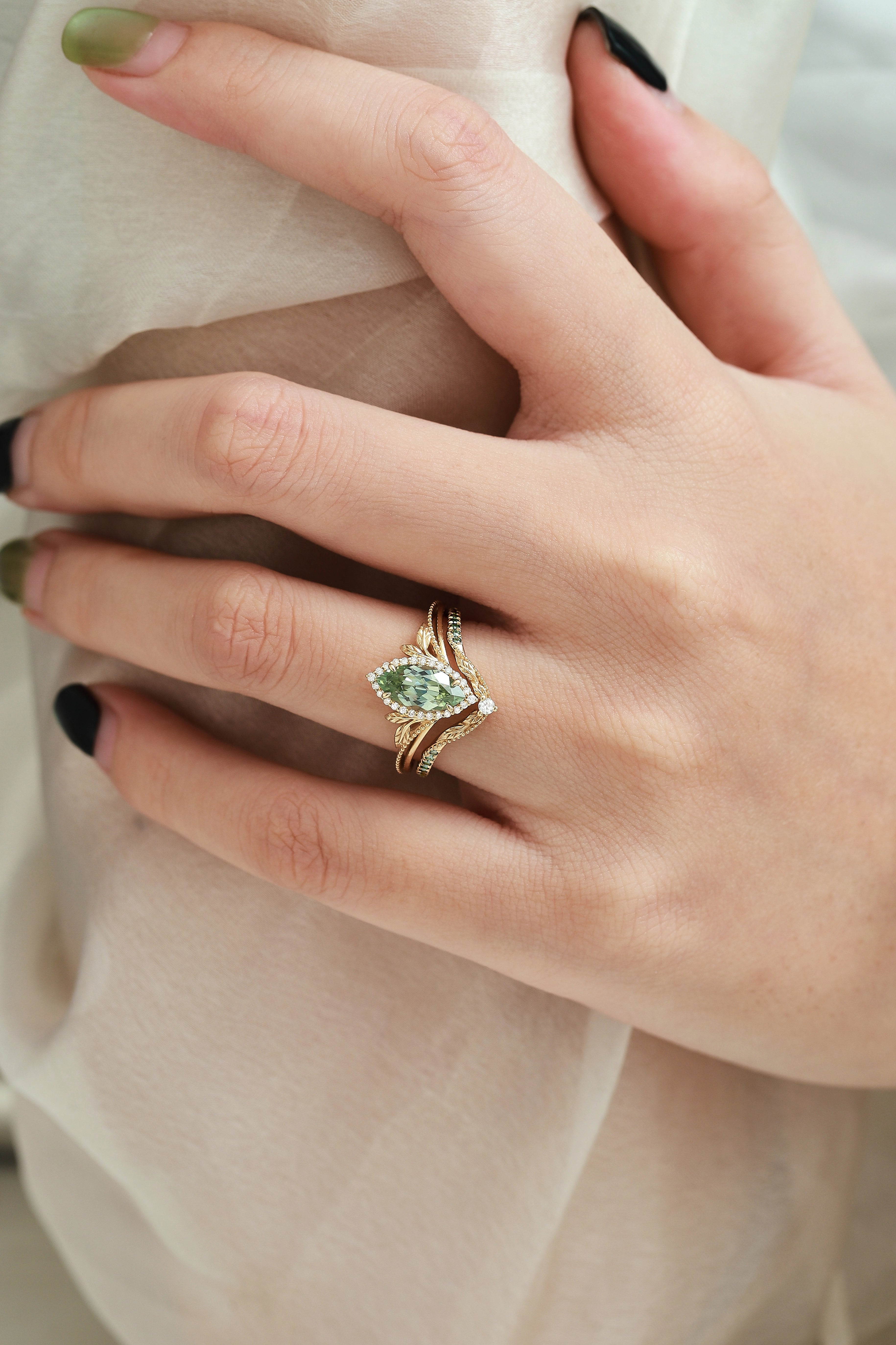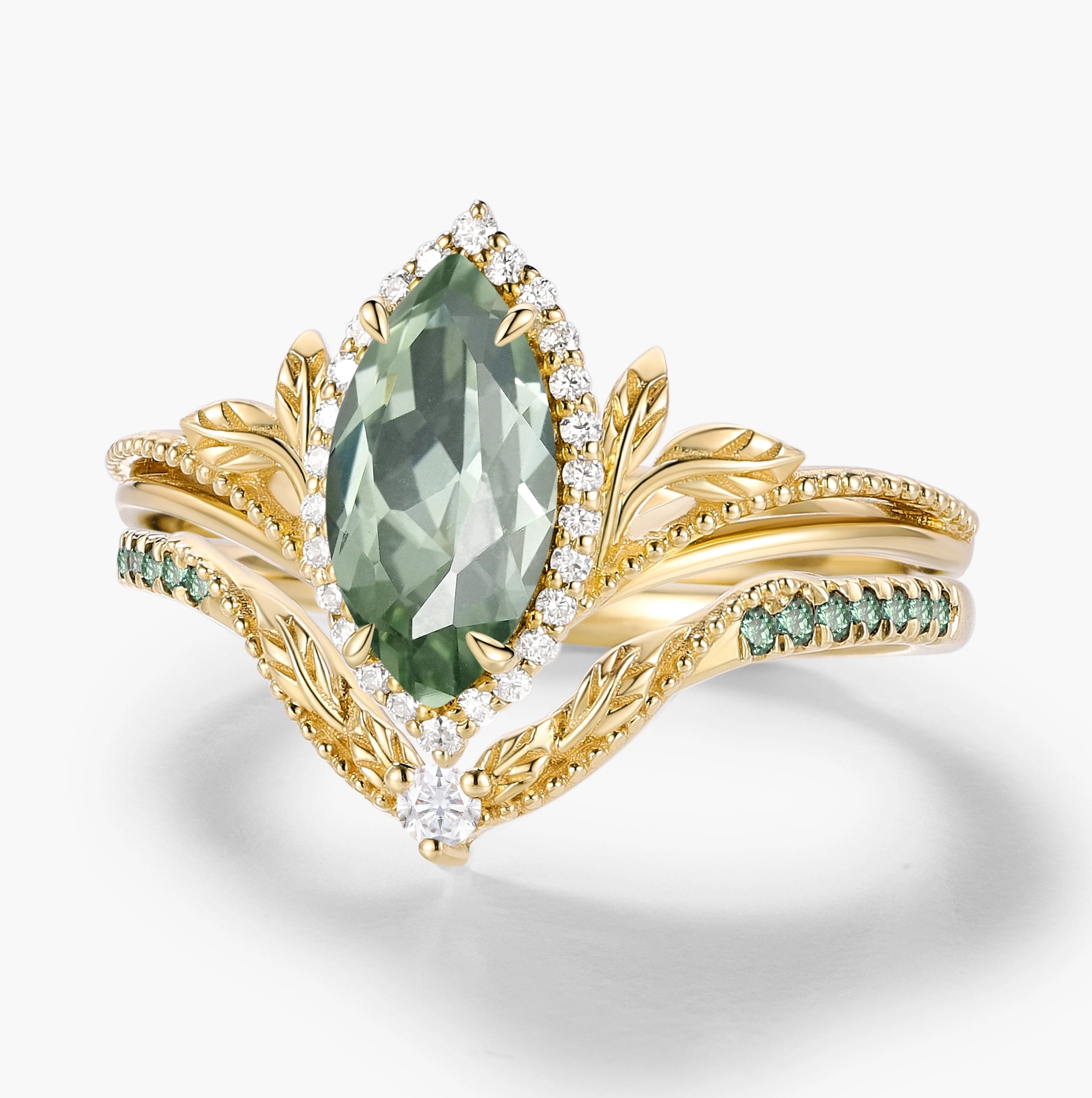 Nature-Inspired Marquise Green Sapphire Engagement Ring with Milgrain Halo & Wedding Band 2PCS