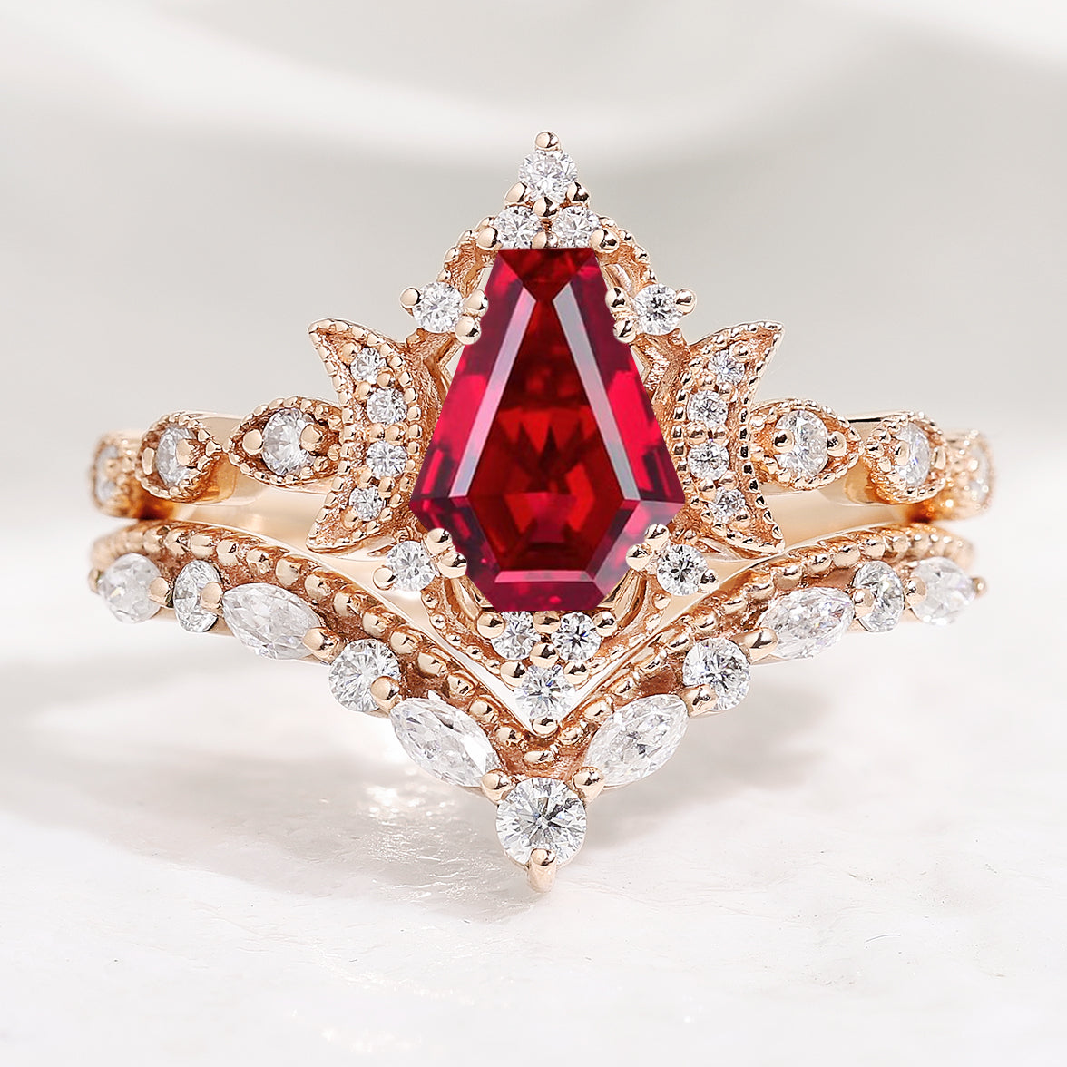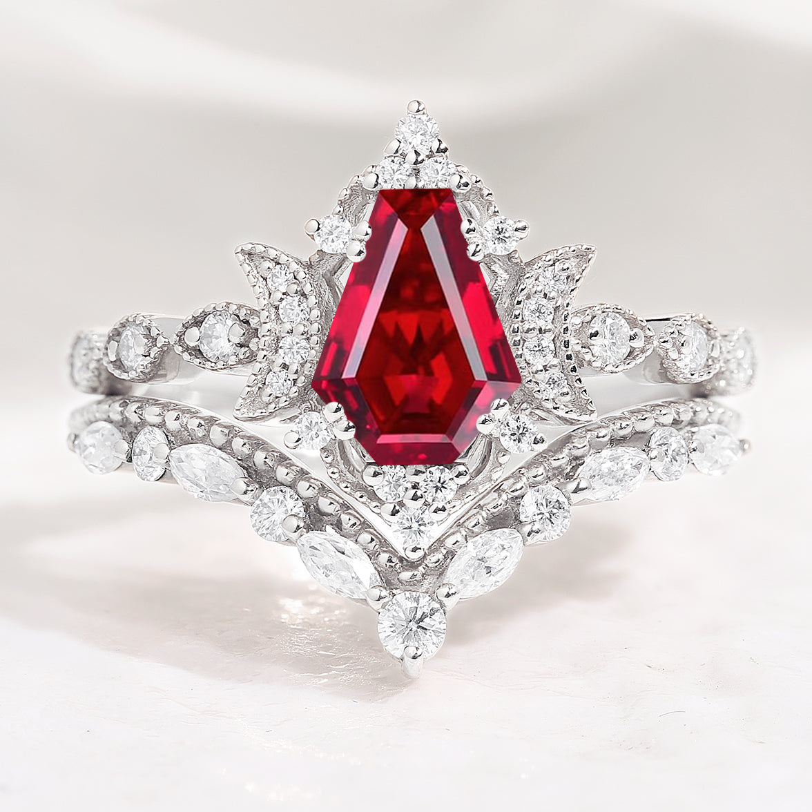 Coffin Cut Ruby Engagement Ring Bridal Set 2pcs