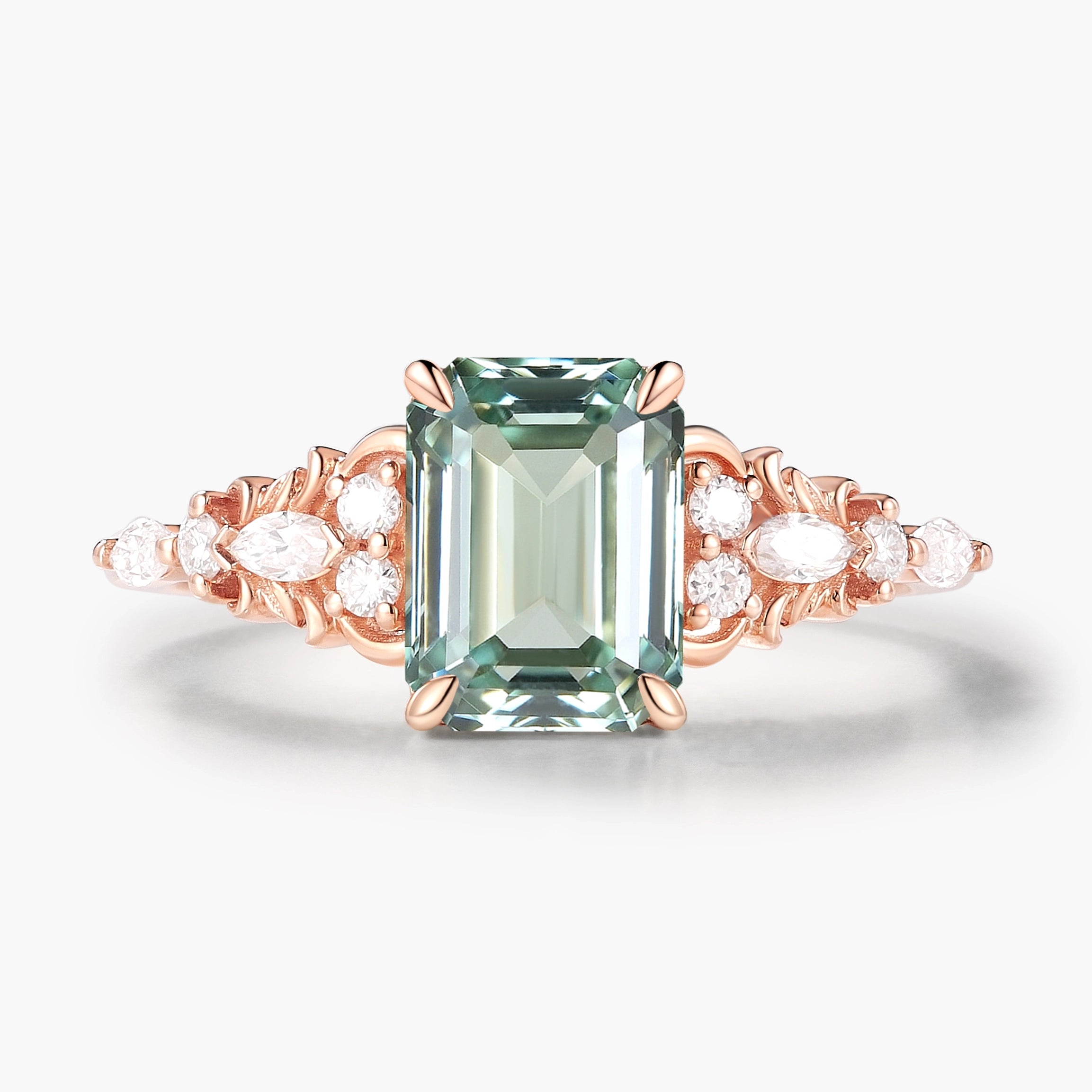 Nature-Inspired Emerald-Cut Green Sapphire Engagement Ring with Moissanite Accents