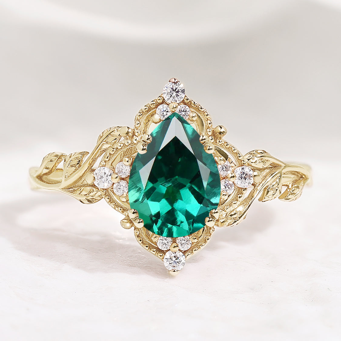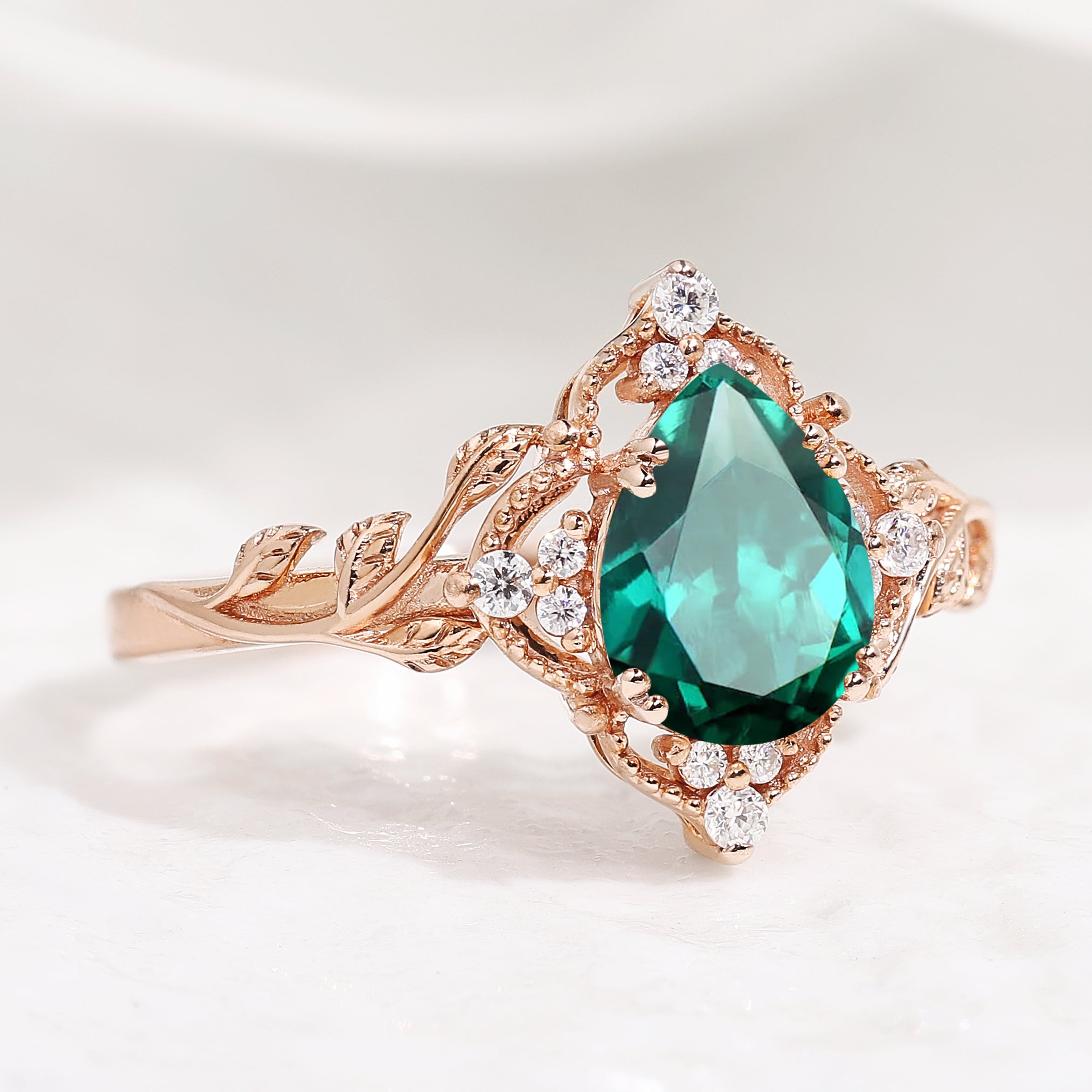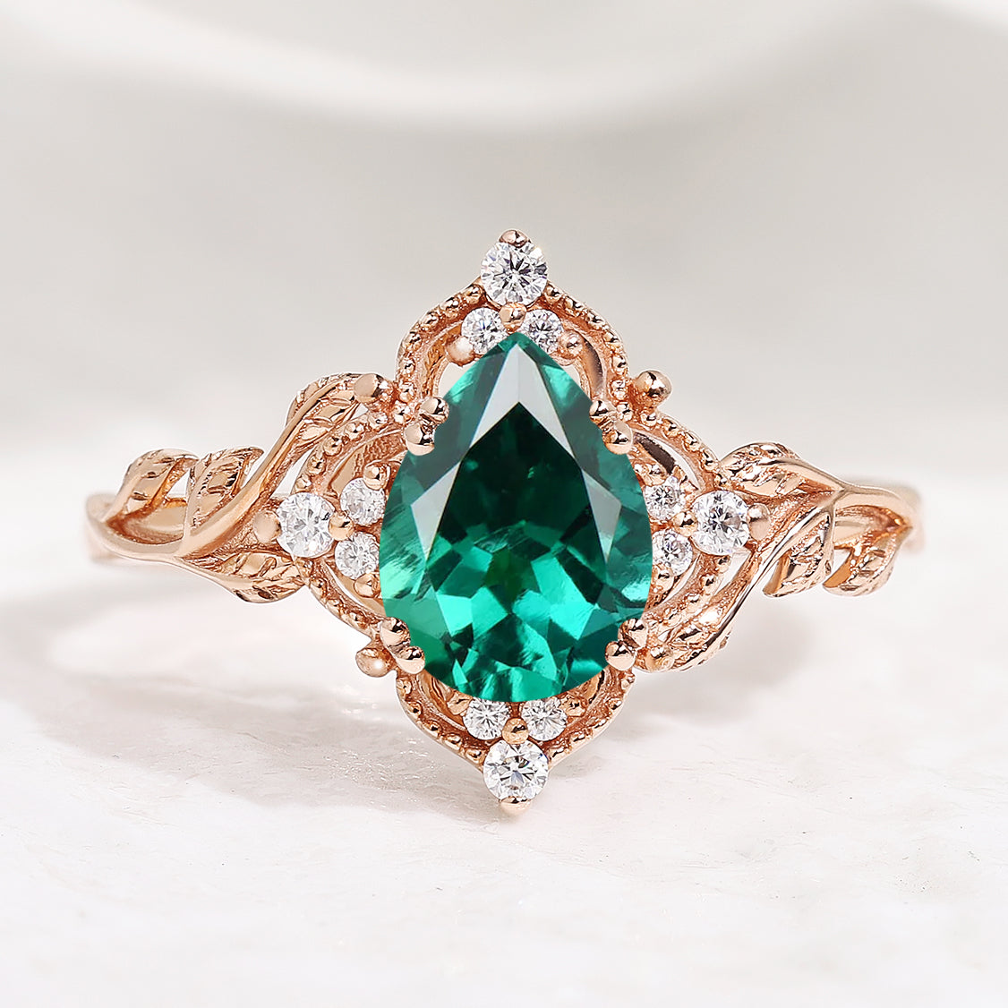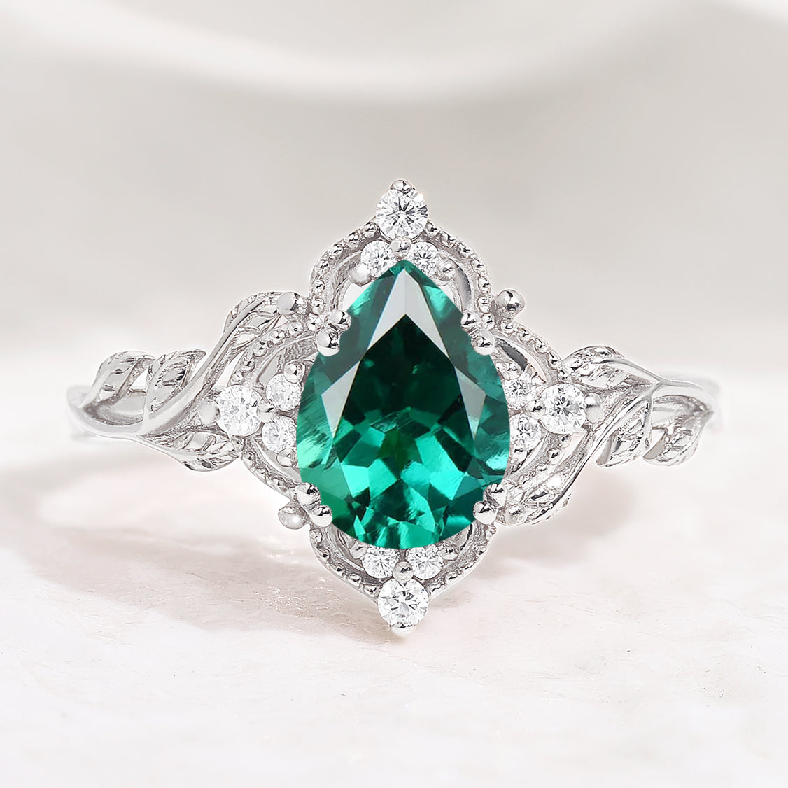 Nature Inspired Leaf Engagement Ring Pear Cut Lab Emerald Ring