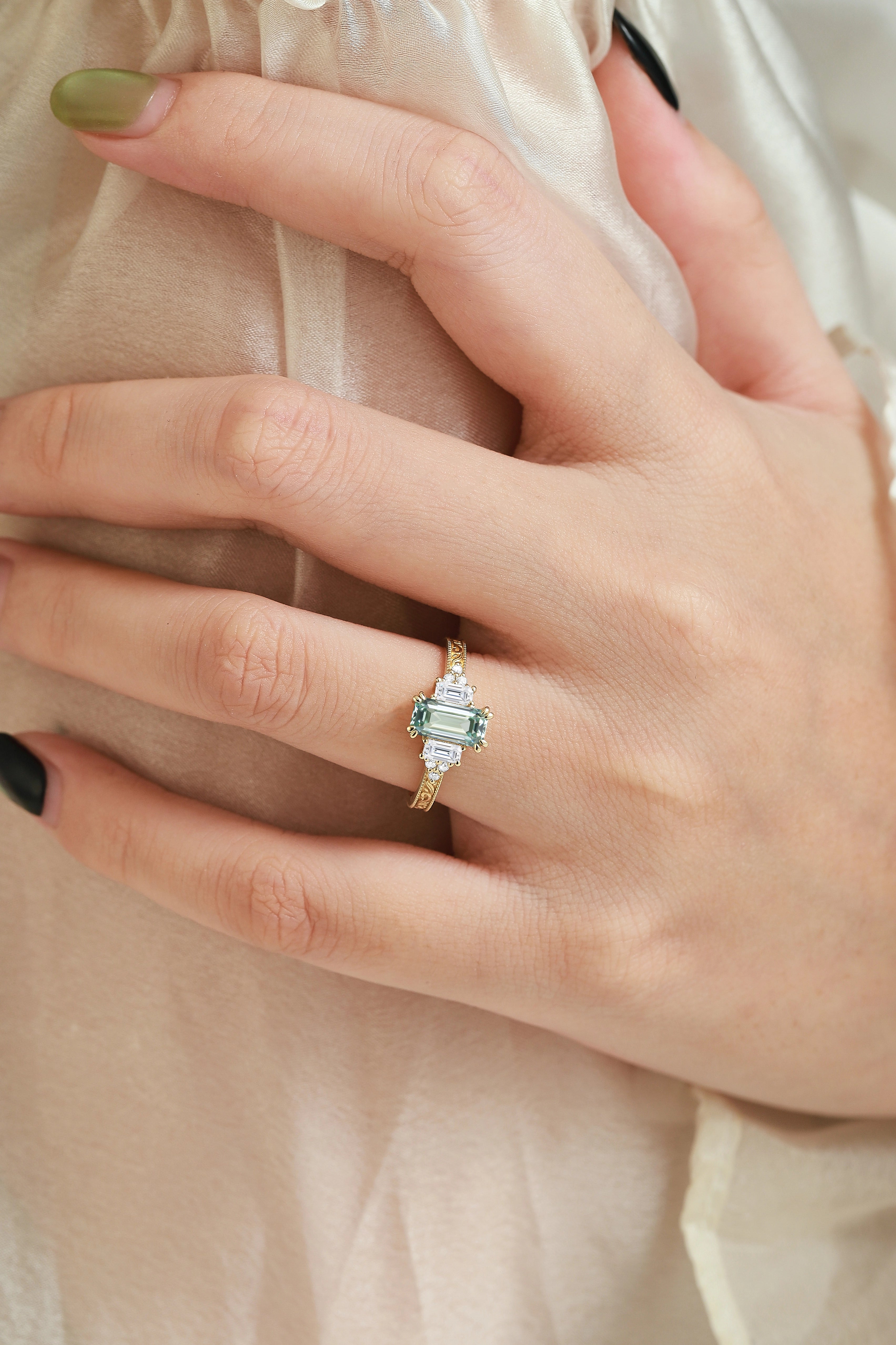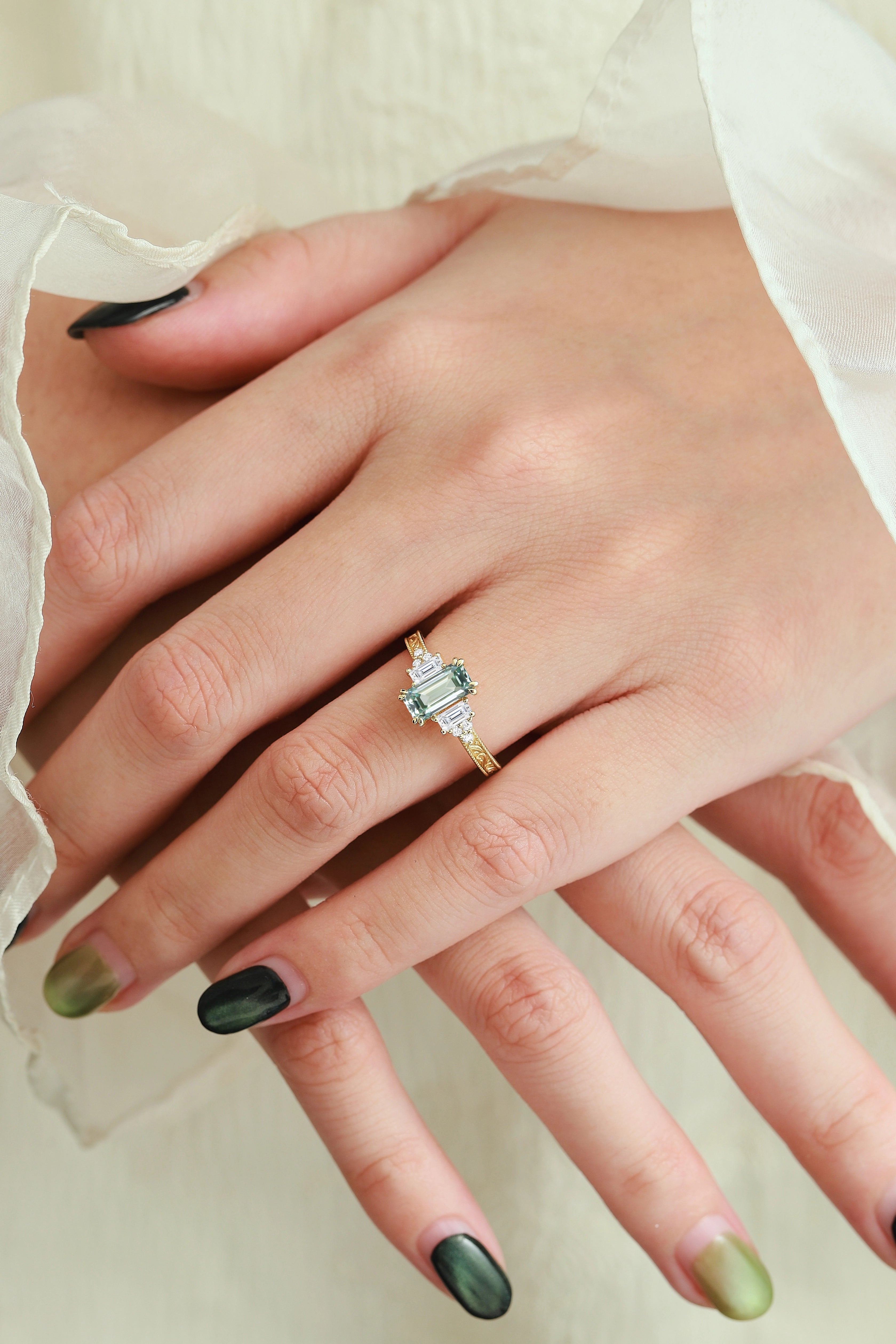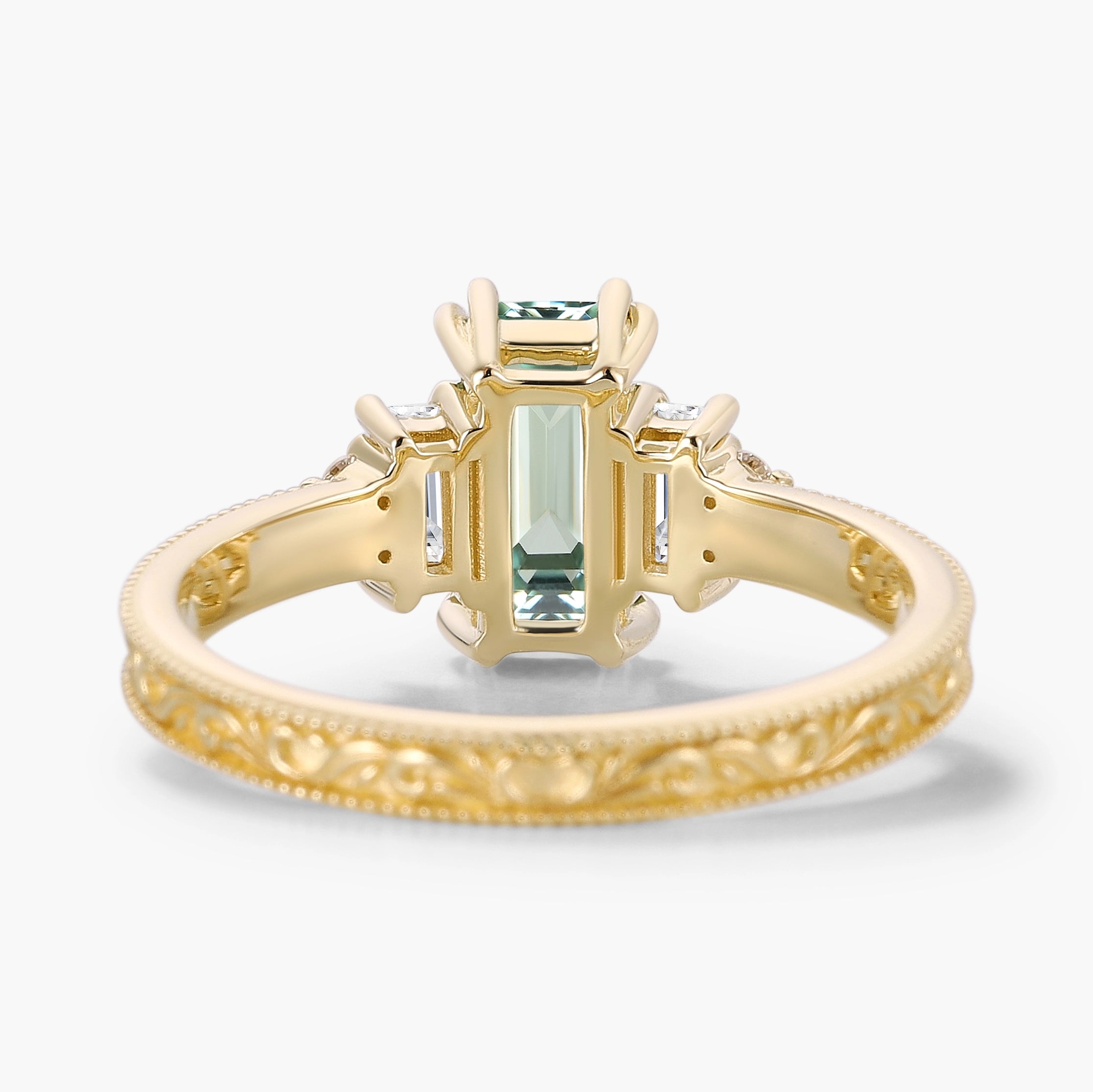 This emerald-cut teal sapphire engagement ring showcases a graceful three-stone design, featuring two smaller emerald-cut moissanite on each side for a clean, balanced look. The center and side stones are wrapped in a sleek bezel setting, bringing a vintage-meets-modern feel while offering added security. Delicate pave accents highlight the side stones, and the band carries subtle handcrafted details that enhance the natural elegance of the piece. A refined choice for those who love geometric emerald cuts paired with a smooth, timeless bezel edge.