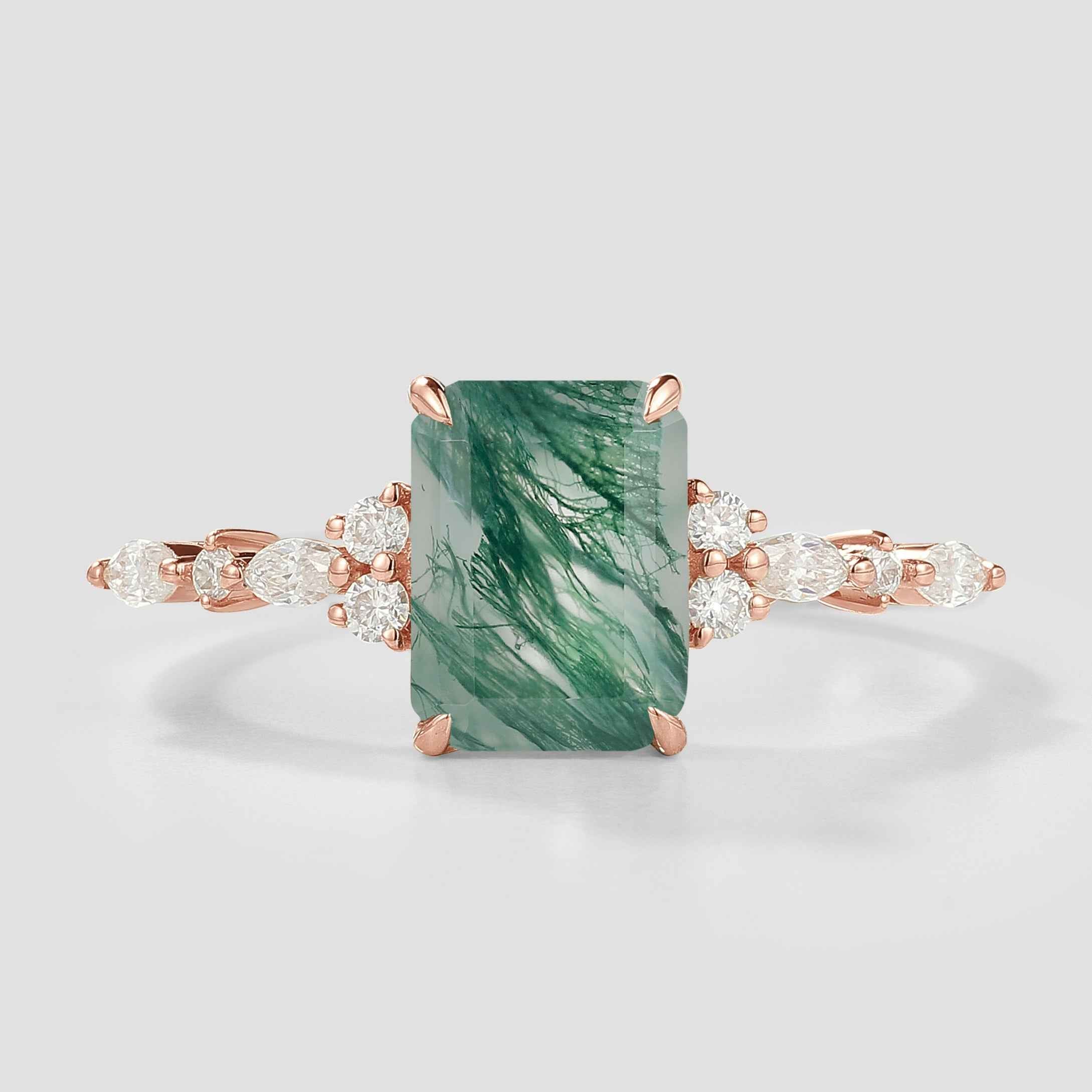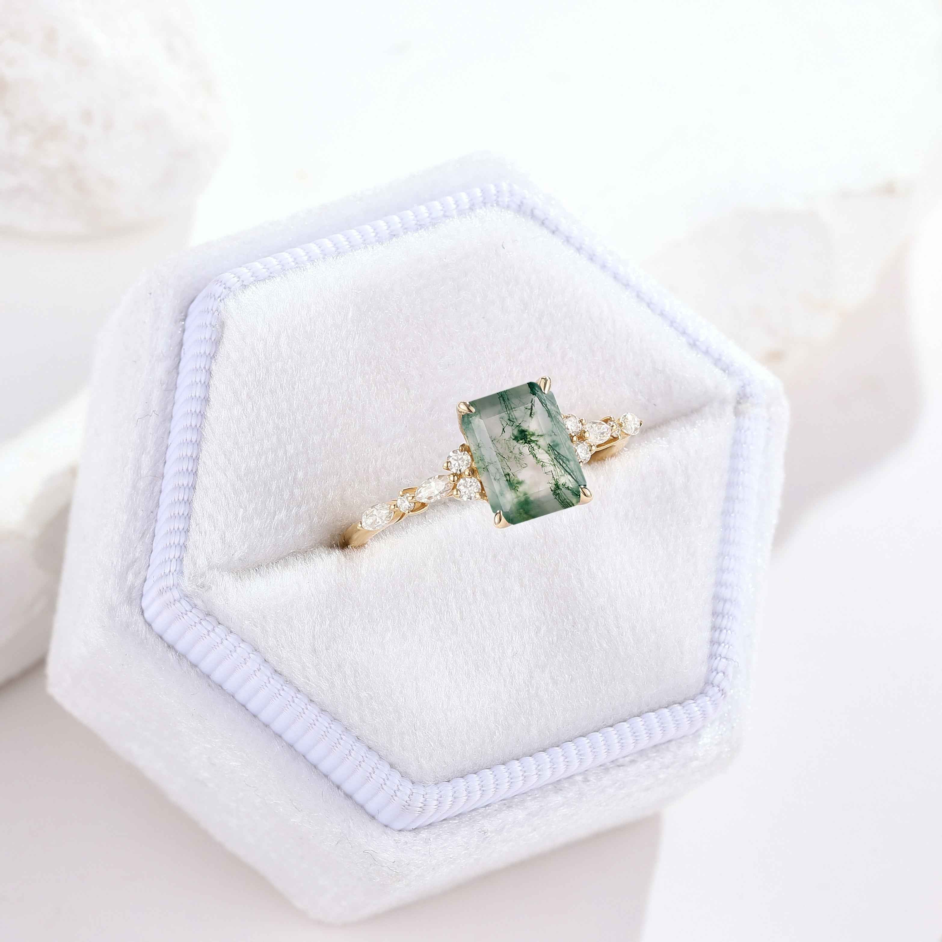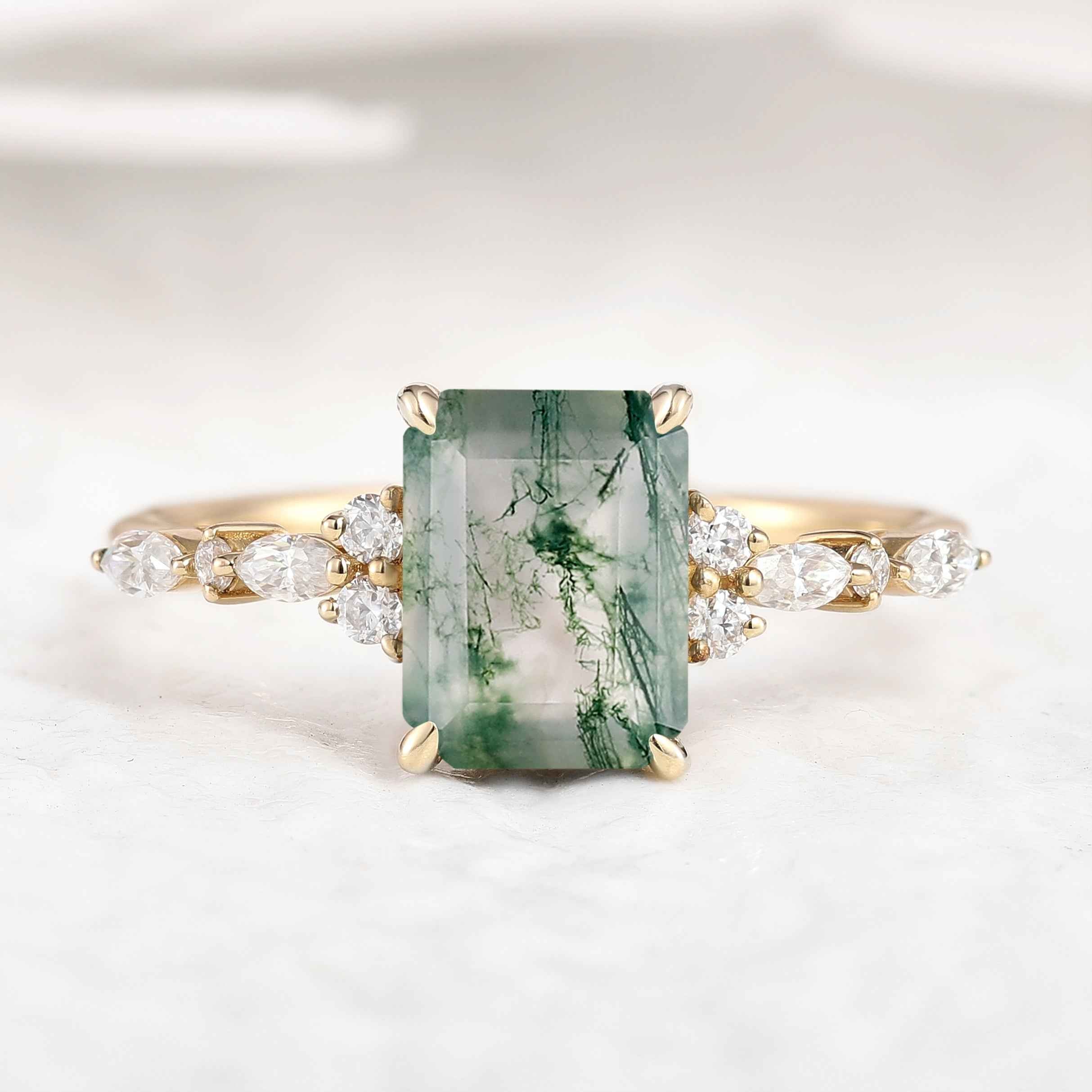 Signautre Vintage Emerald Cut Moss Agate Engagement Ring