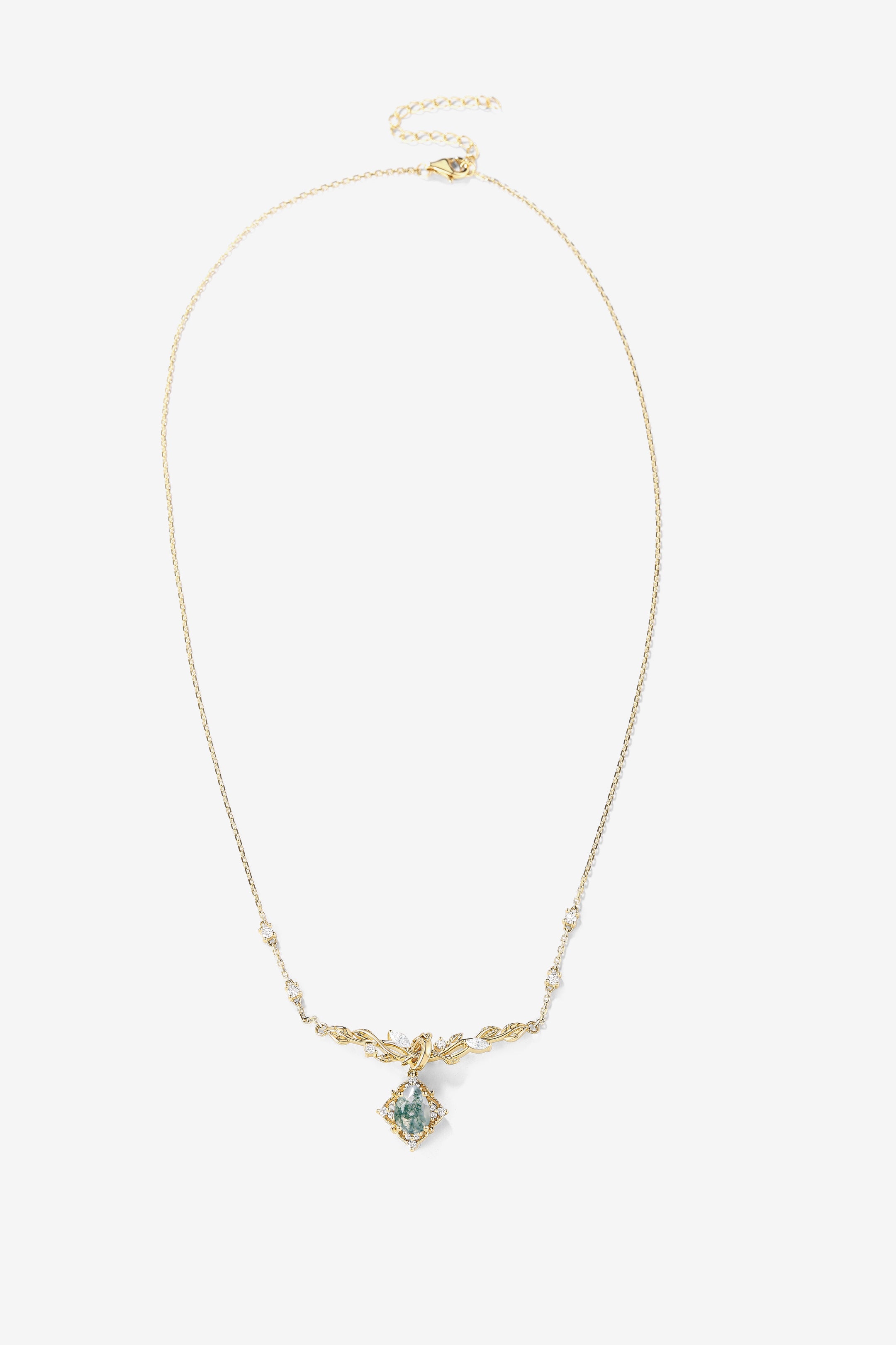 Inspired by the beauty of nature, this necklace features a pear-cut moss agate framed with delicate leafy details. Each gemstone is unique, showcasing natural green inclusions that resemble tiny landscapes within the stone. Set in solid gold and finished with an adjustable chain, this piece brings a touch of organic elegance to your everyday style or a meaningful gift for someone special.