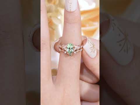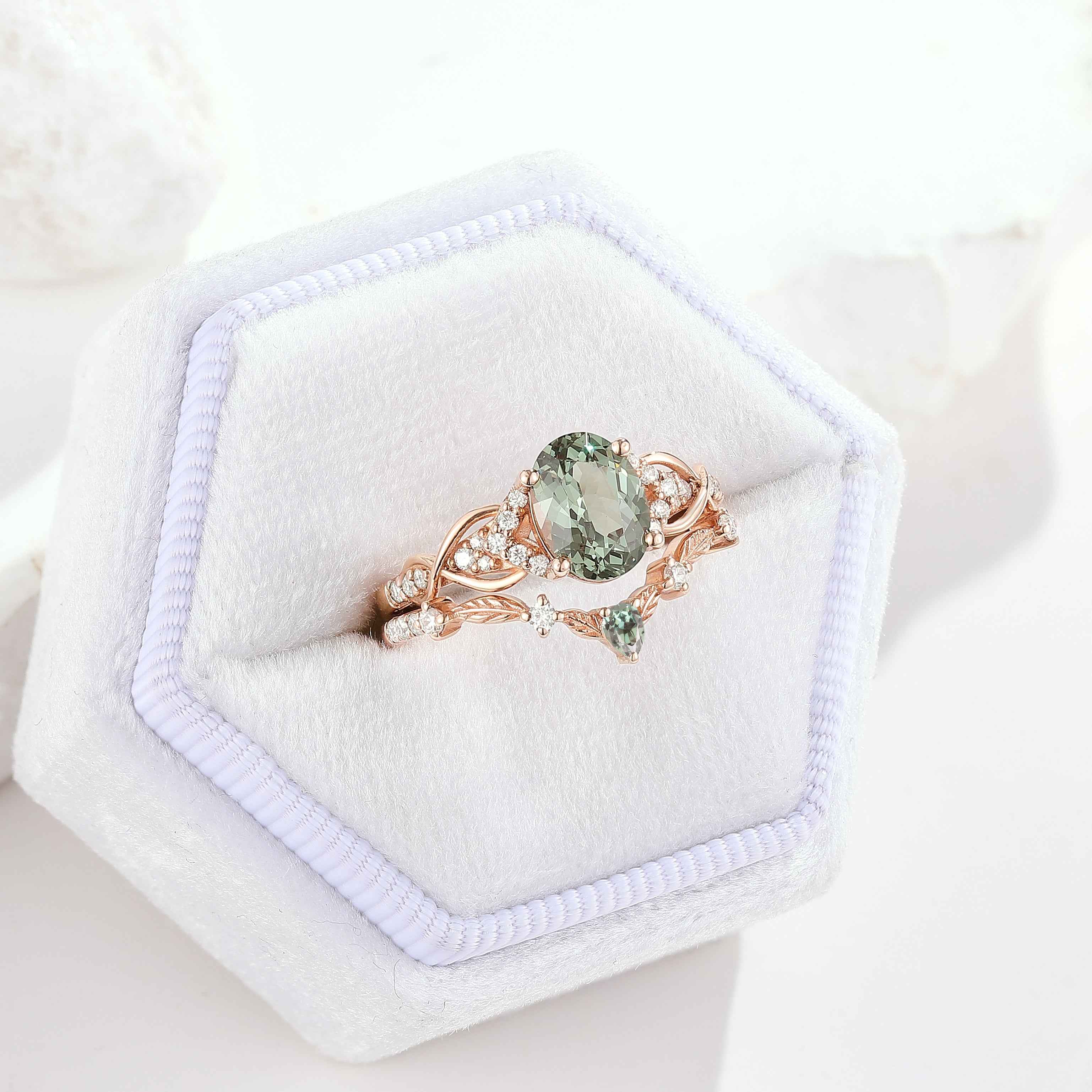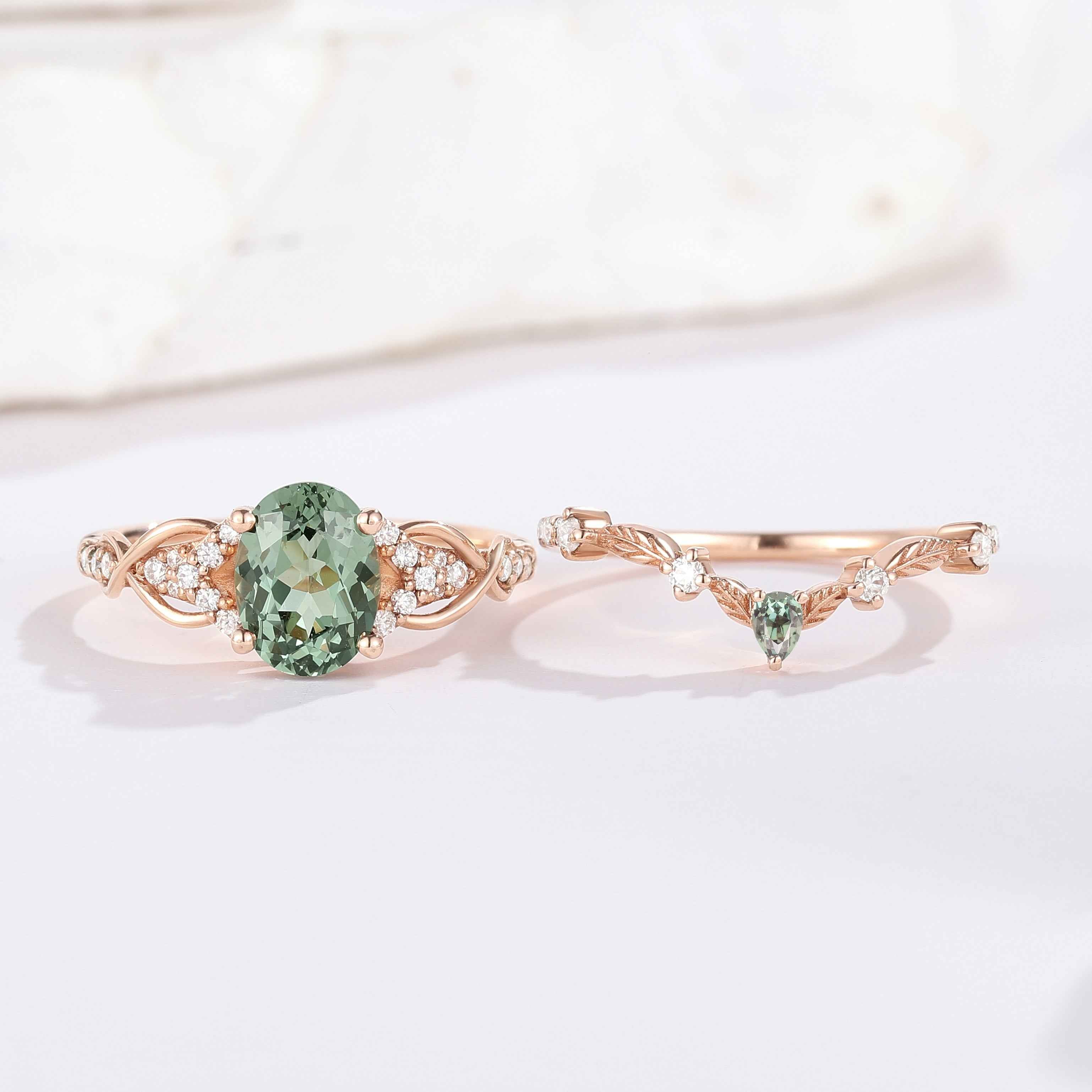 Unique Oval Cut Green Sapphire Engagement Ring Set Leafy Wedding Band