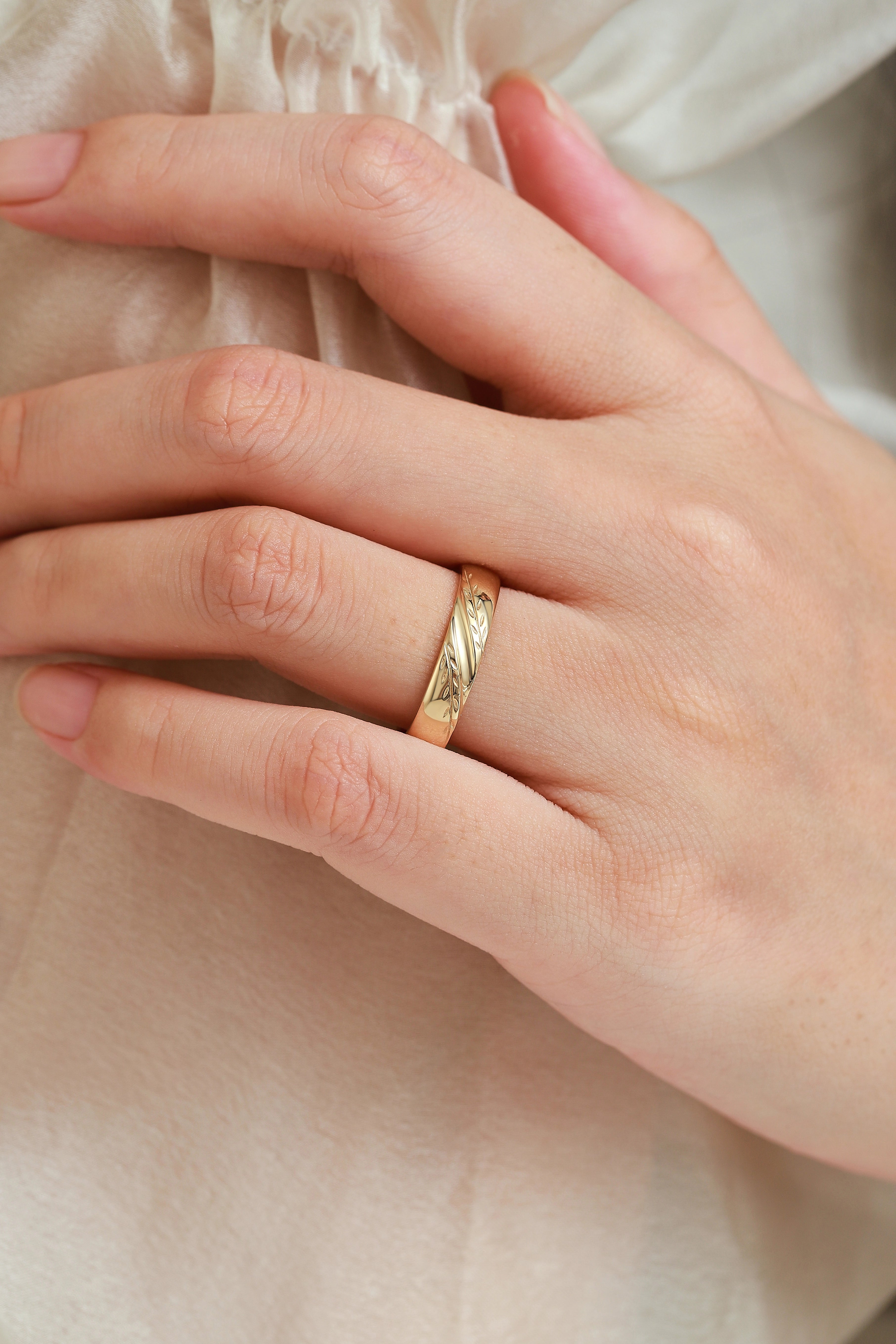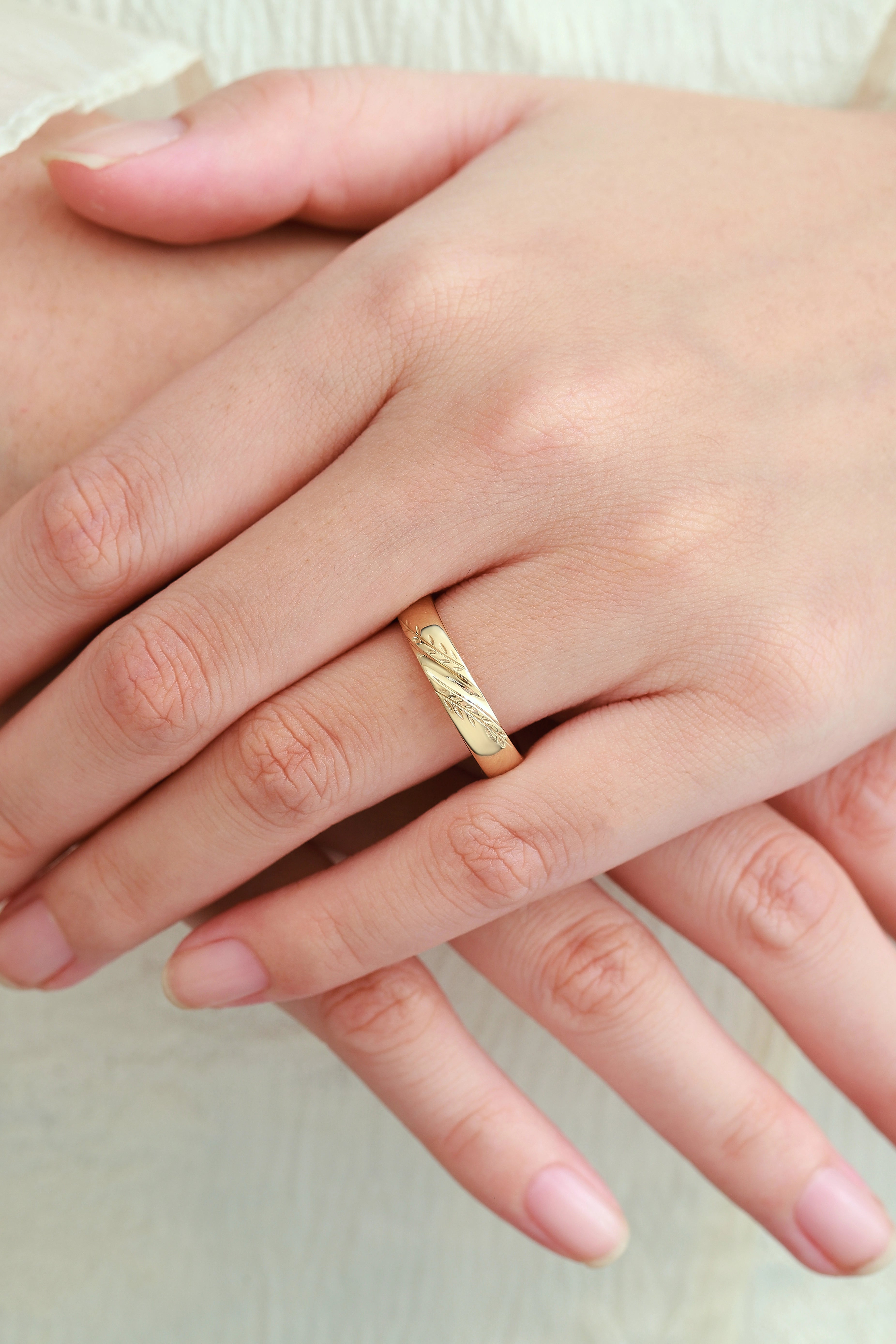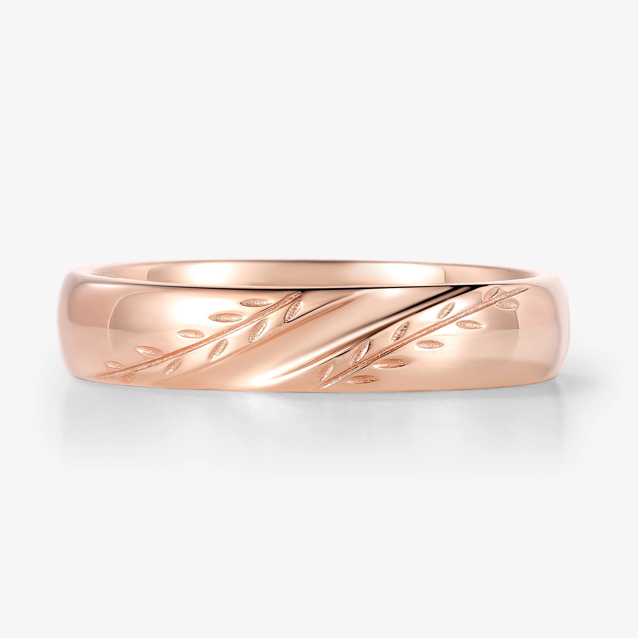 This men's wedding band features a smooth, polished surface adorned with intricate leaf engravings, blending timeless elegance with natural inspiration. Its vintage-inspired detailing adds character and depth, making it a meaningful choice for your wedding day. Crafted with careful attention to detail, the design symbolizes enduring love and the steady growth of a lifelong commitment.