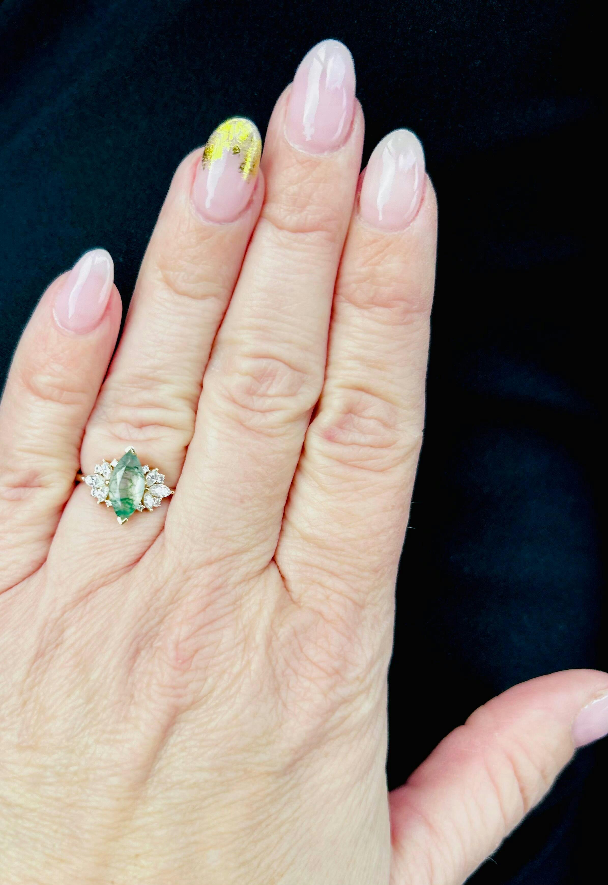 Make a statement of everlasting love with this stunning marquise cut moissanite engagement ring. Crafted in exquisite rose gold, this ring showcases a unique blend of vintage charm and modern elegance.