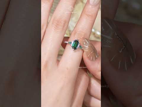 Bold and sophisticated, this engagement ring features a striking long hexagon-cut lab-created emerald and two kite cut lab-created emerald accent. Its sleek design highlights the emerald’s vibrant green hue, making it a perfect choice for those who love modern elegance with a unique touch.