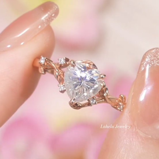 A vibrant heart-cut moissanite, framed by delicate leaf details, captures nature's elegance and enduring love.