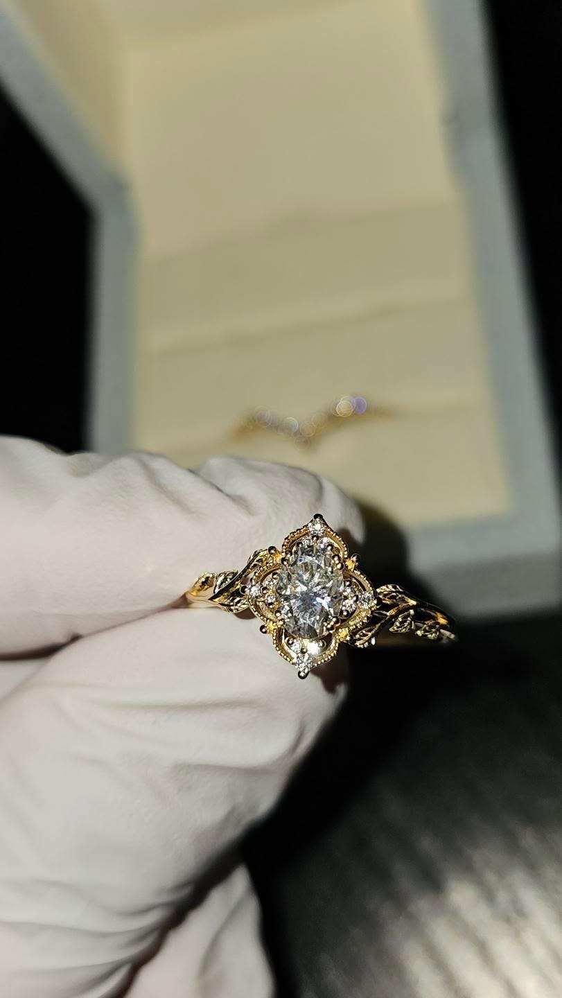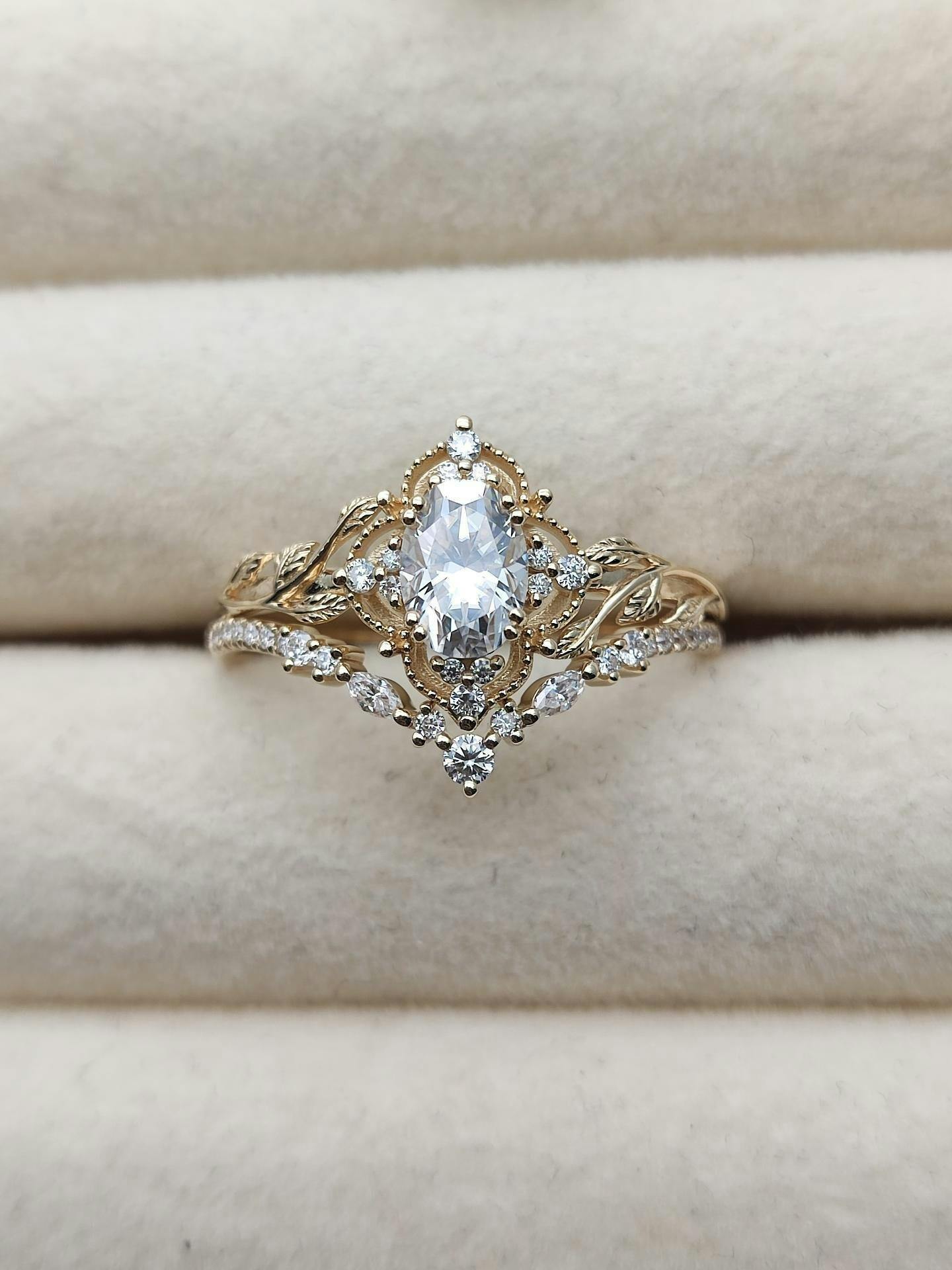 Oval Cut Moissanite Leaf Engagement Ring Bridal Set 2pcs