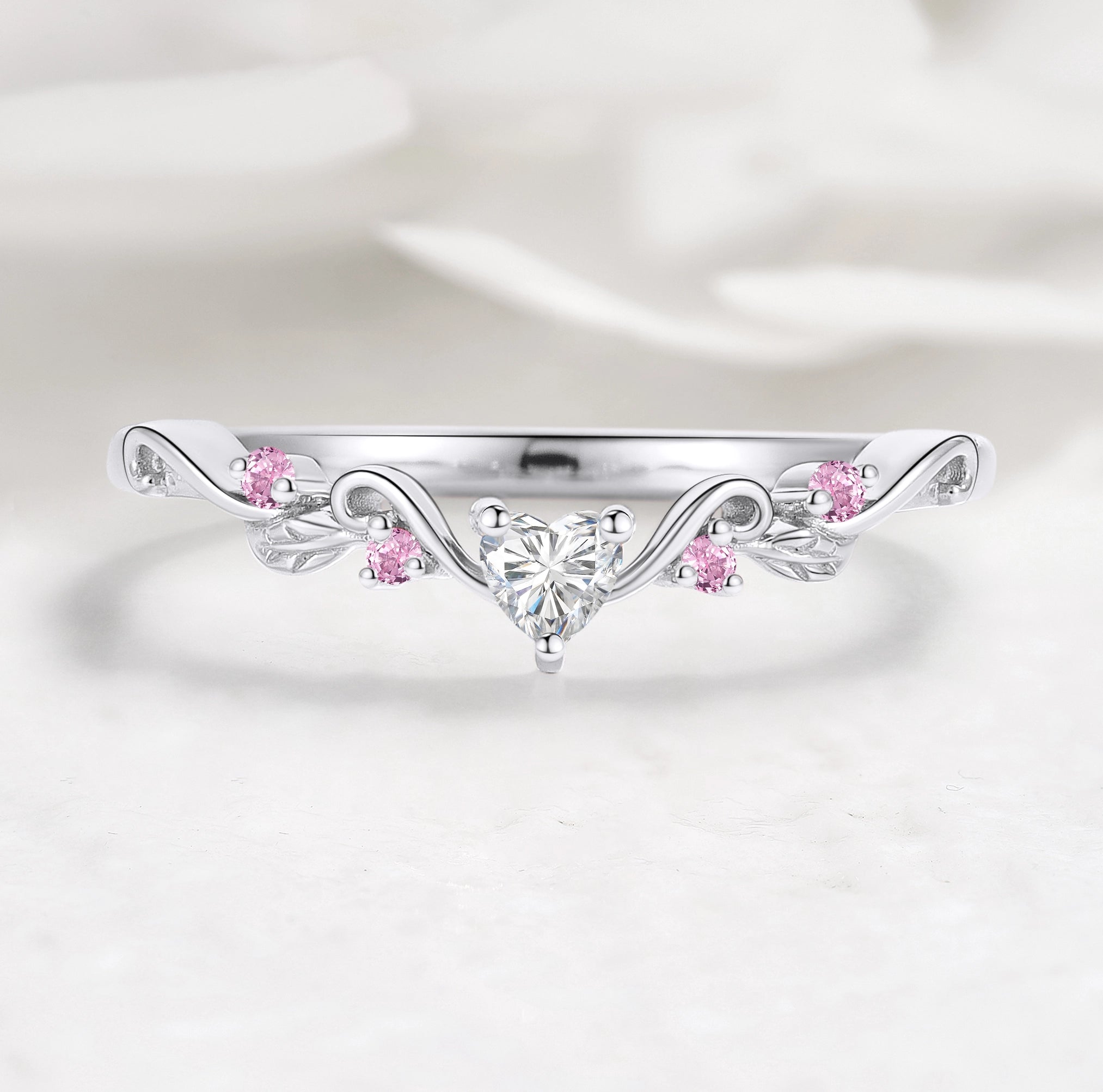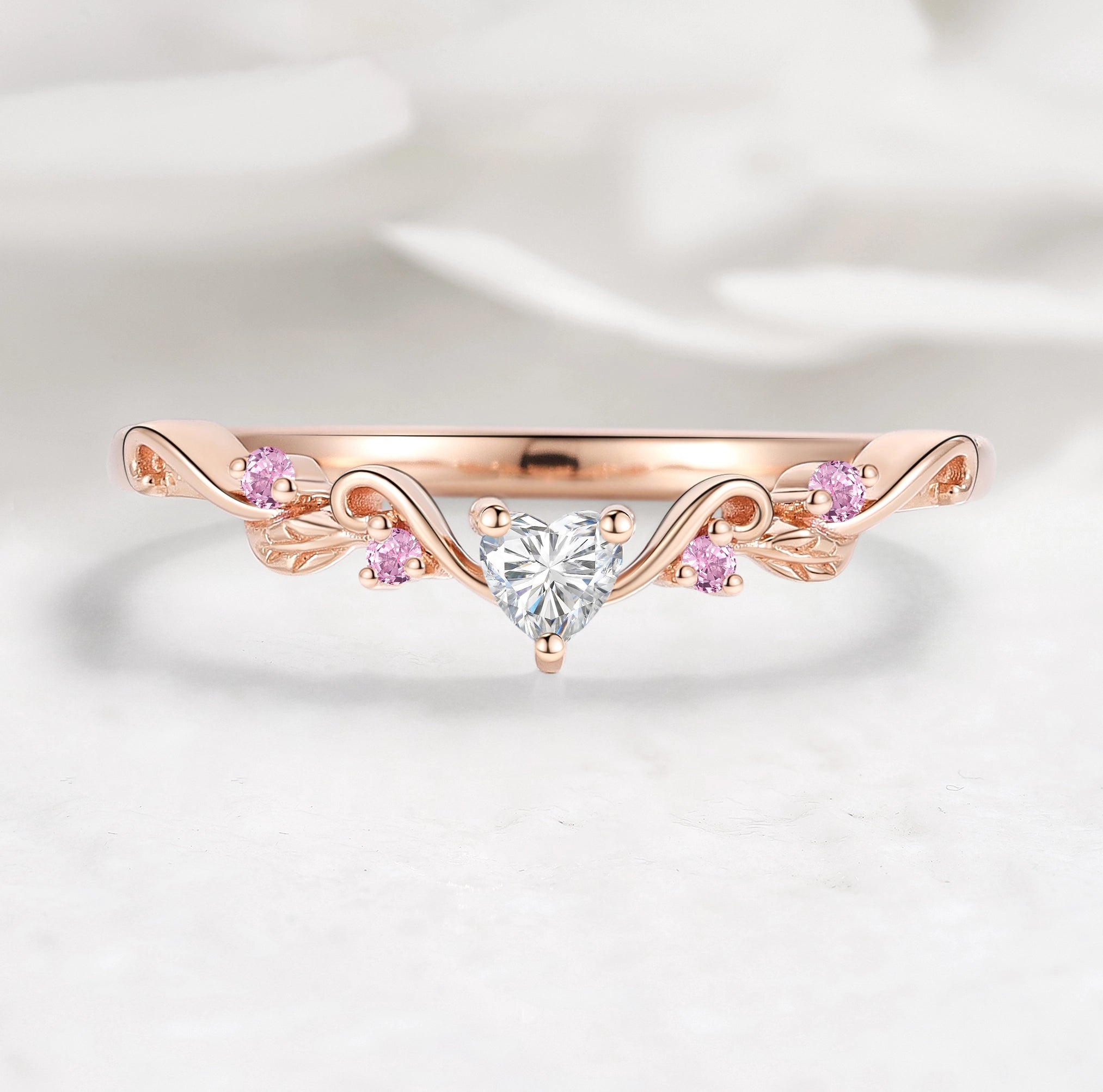 Nature Inspired Heart & Leaf Natural Pink Sapphire Moissanite Curved Wedding Band - Amelia