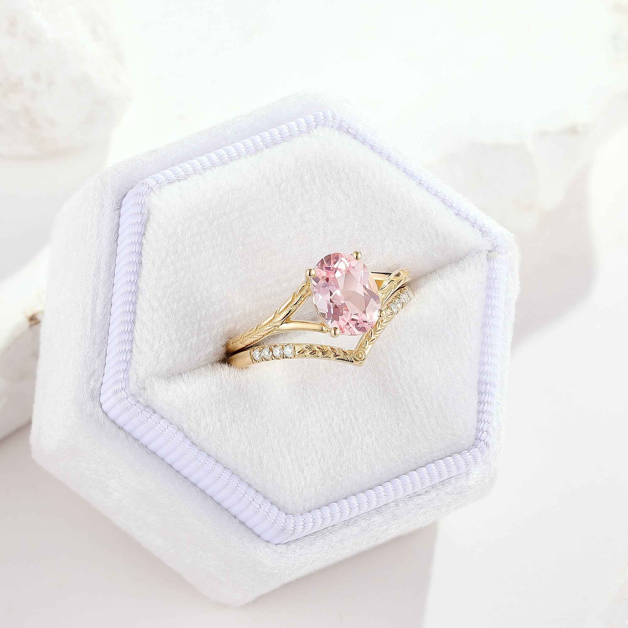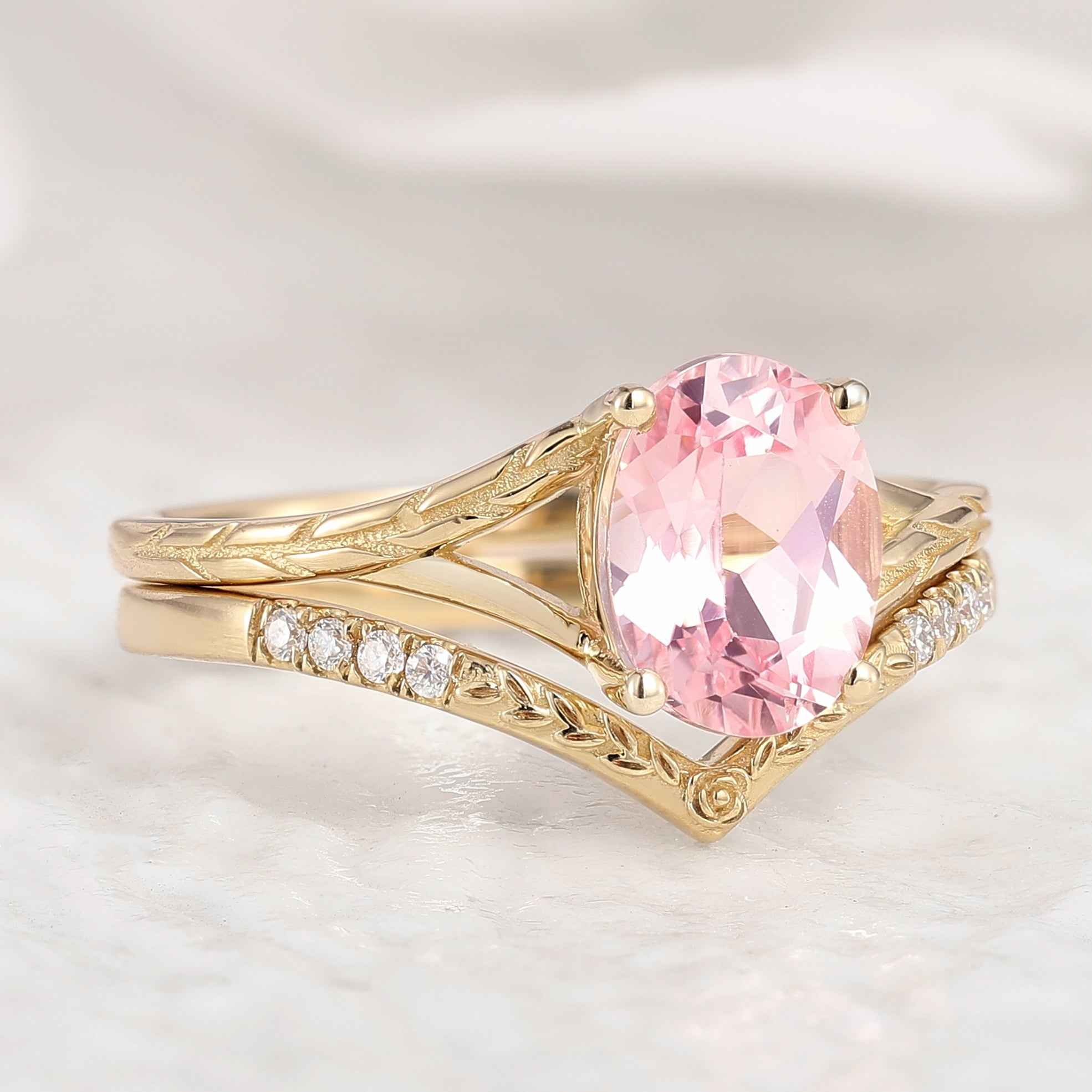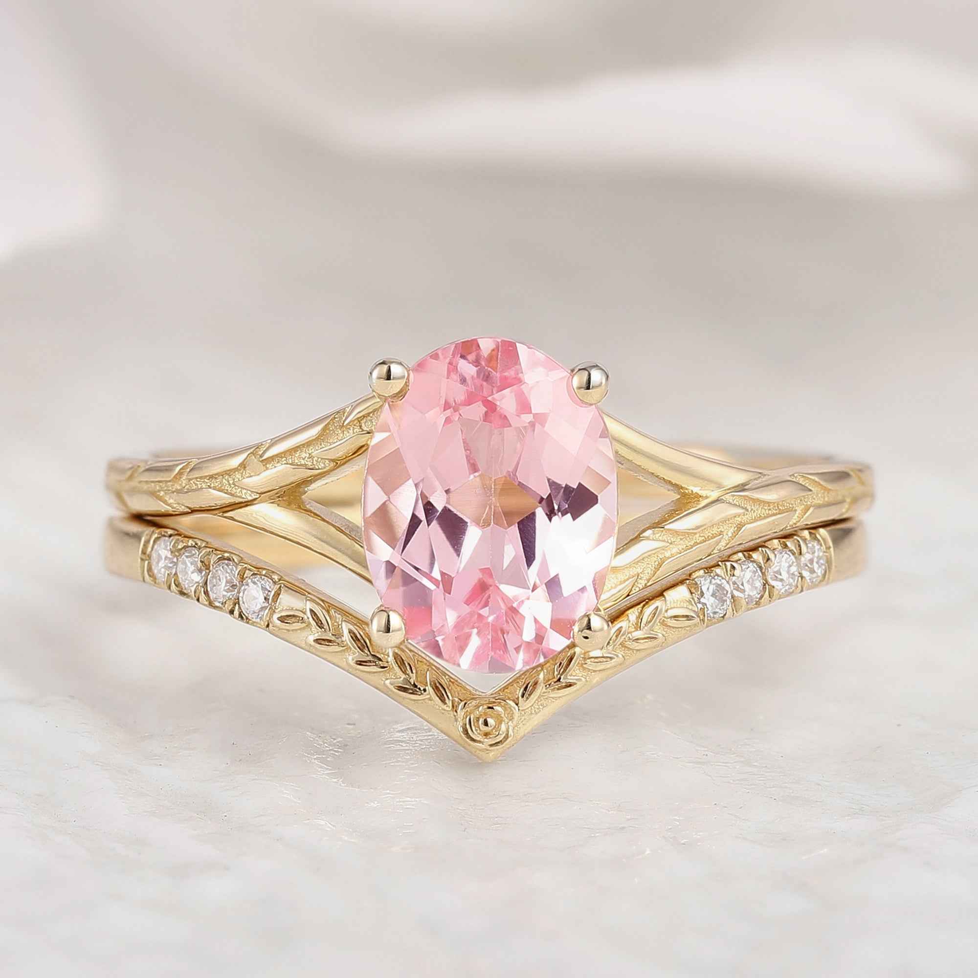 Oval Cut Pink Sapphire Engagement Ring Chevron Wedding Band 2pcs
