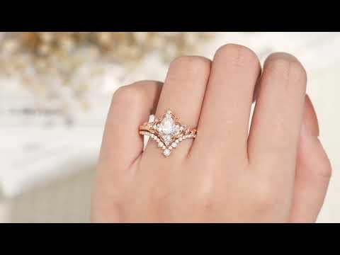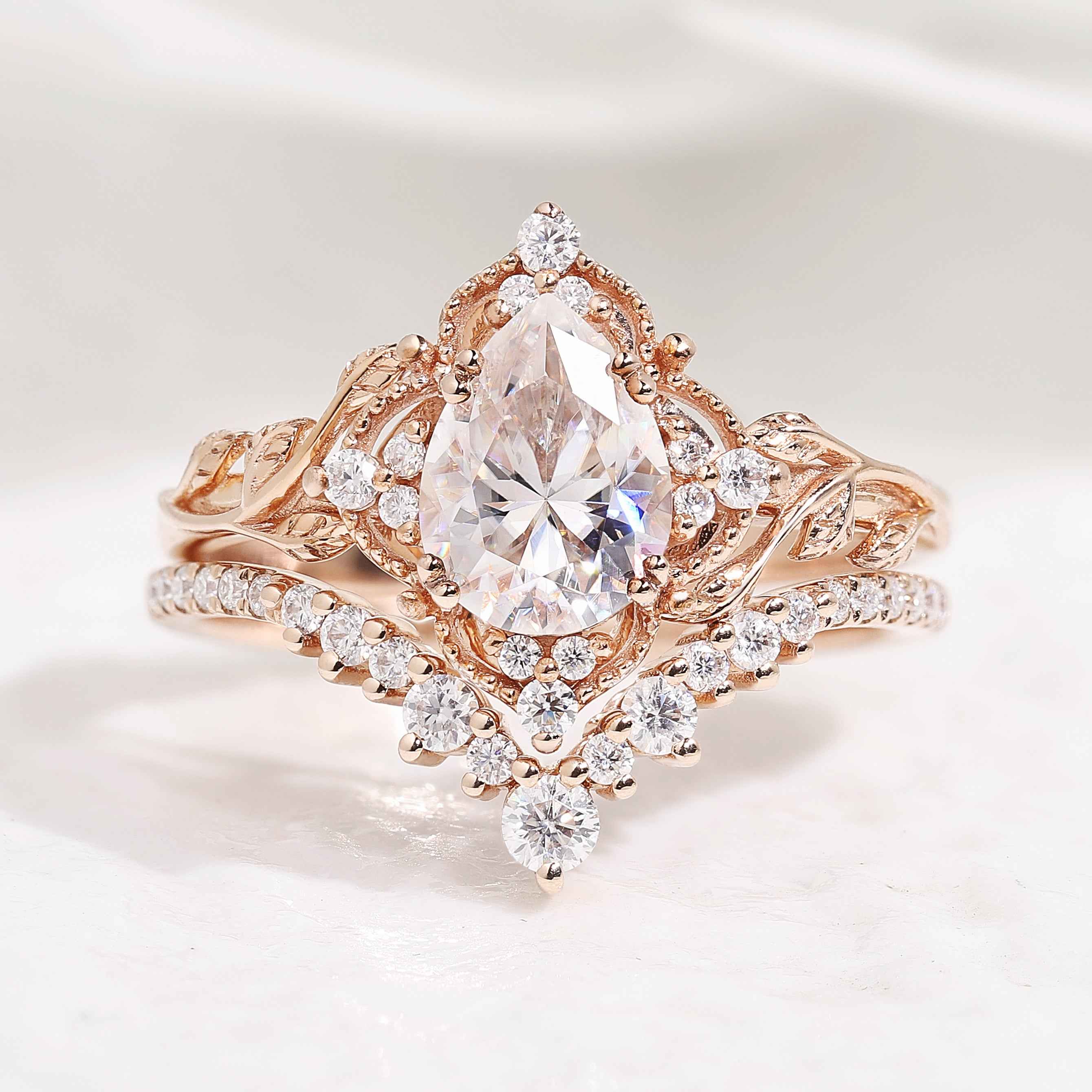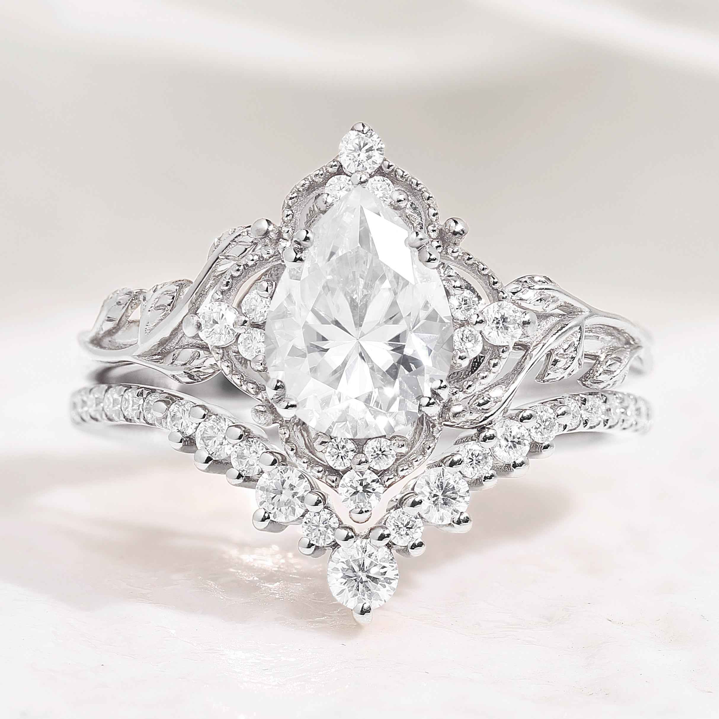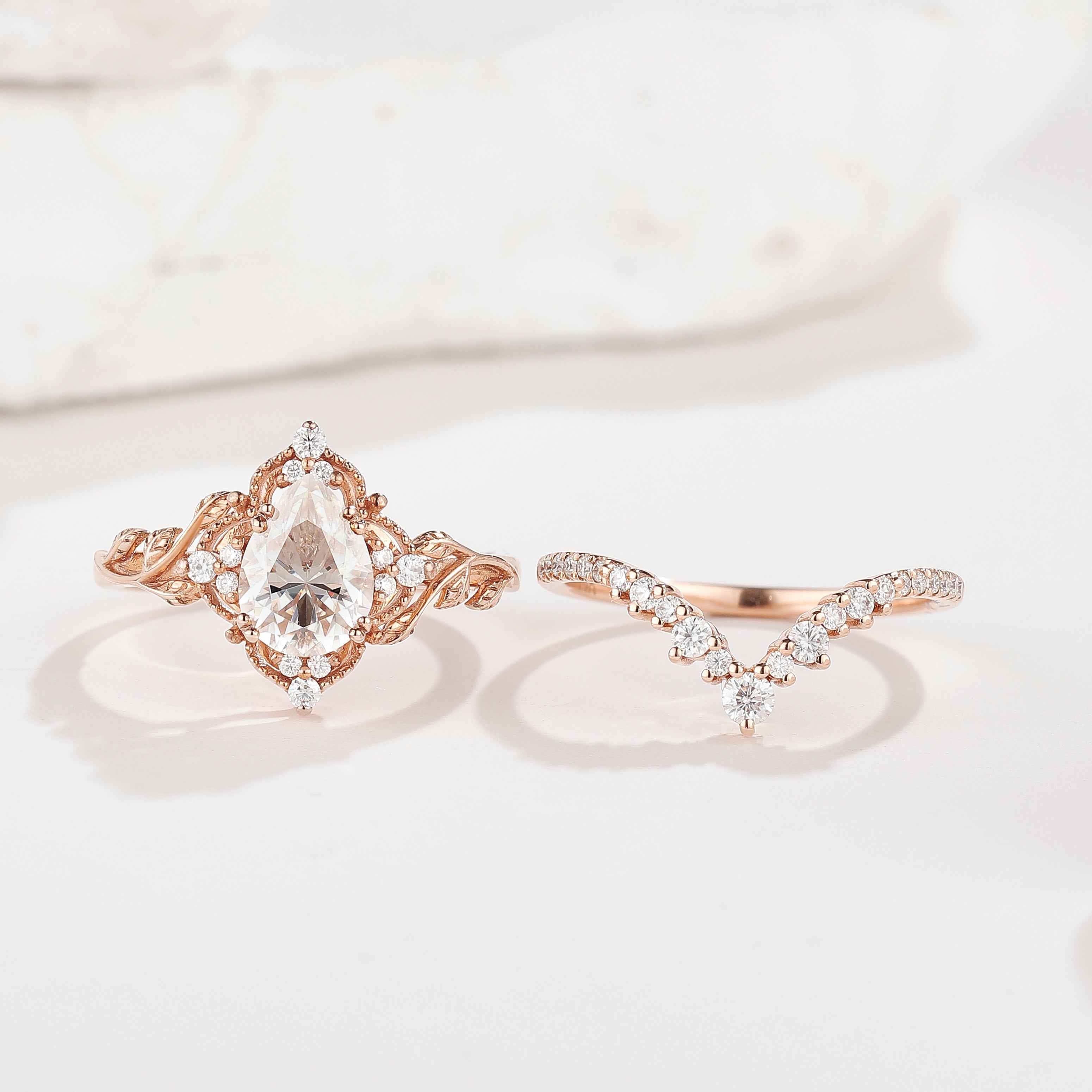 Nature Inspired Leafy Moissanite Engagement Ring Set V Shaped Curved Wedding Band