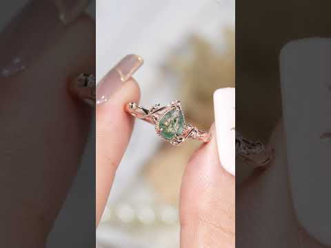 Showcase natural beauty with this pear cut moss agate ring, featuring intricate leaf detailing. Perfect for lovers of unique, nature-inspired designs.
