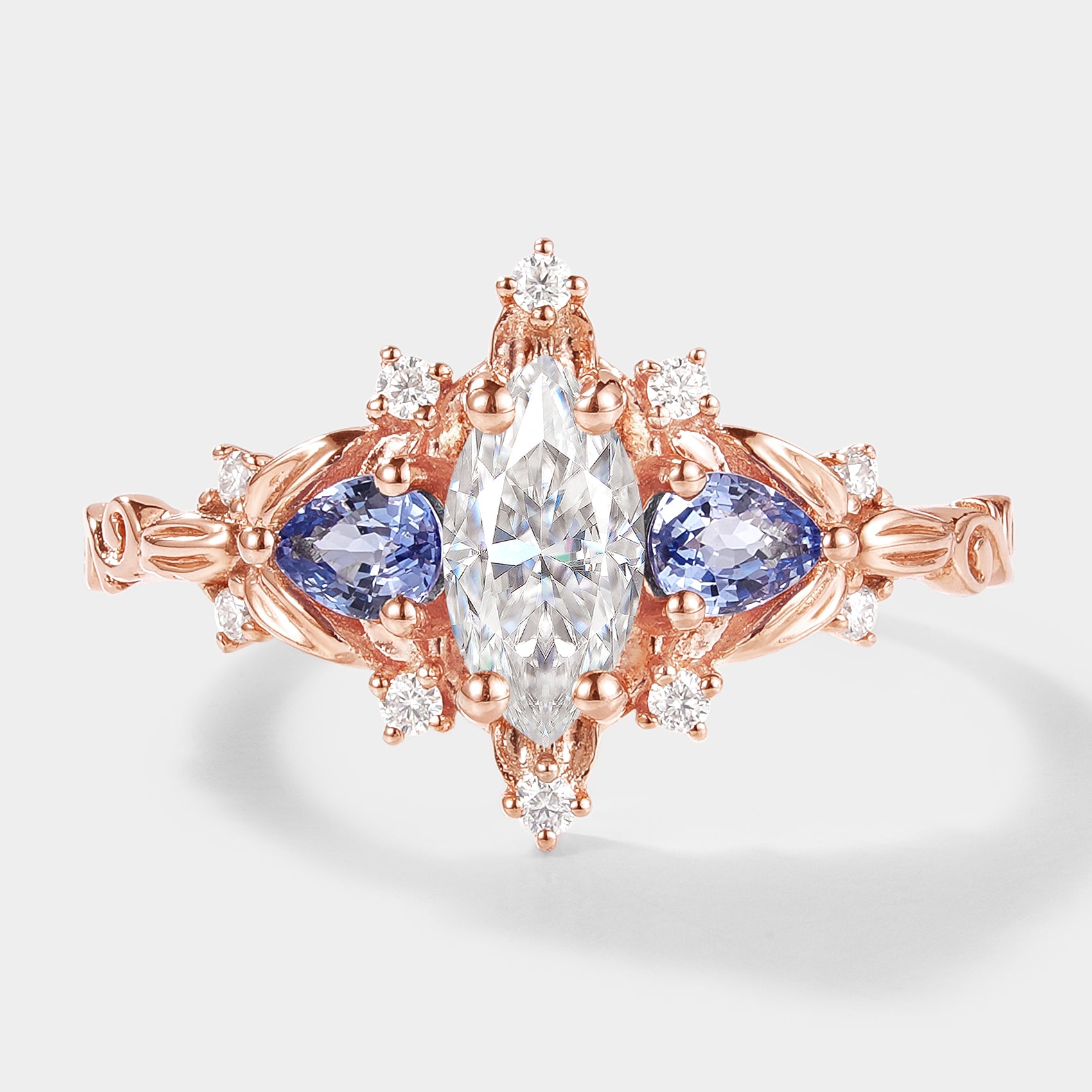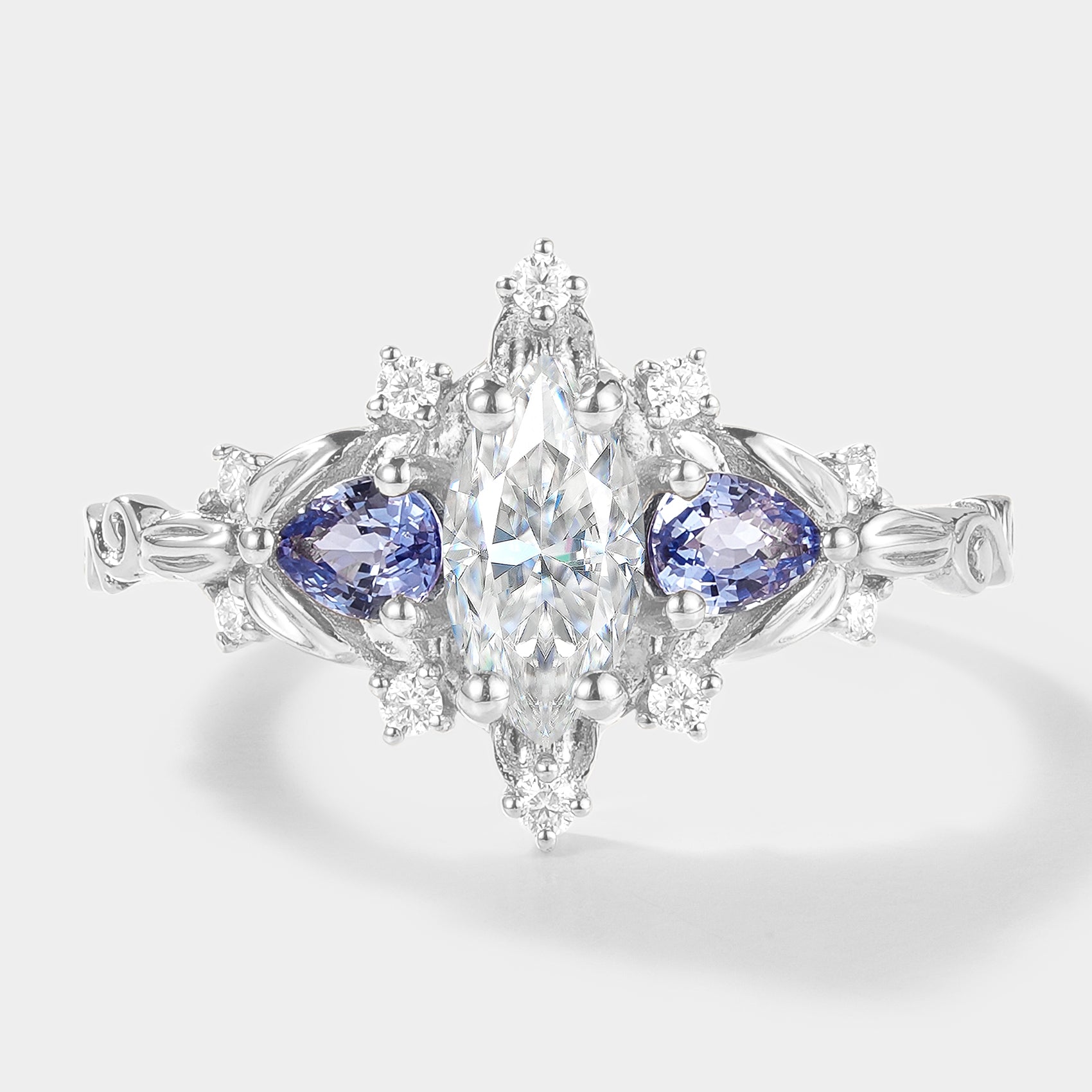 Marquise Cut Moissanite Leaf Engagement Ring Sapphire Cluster